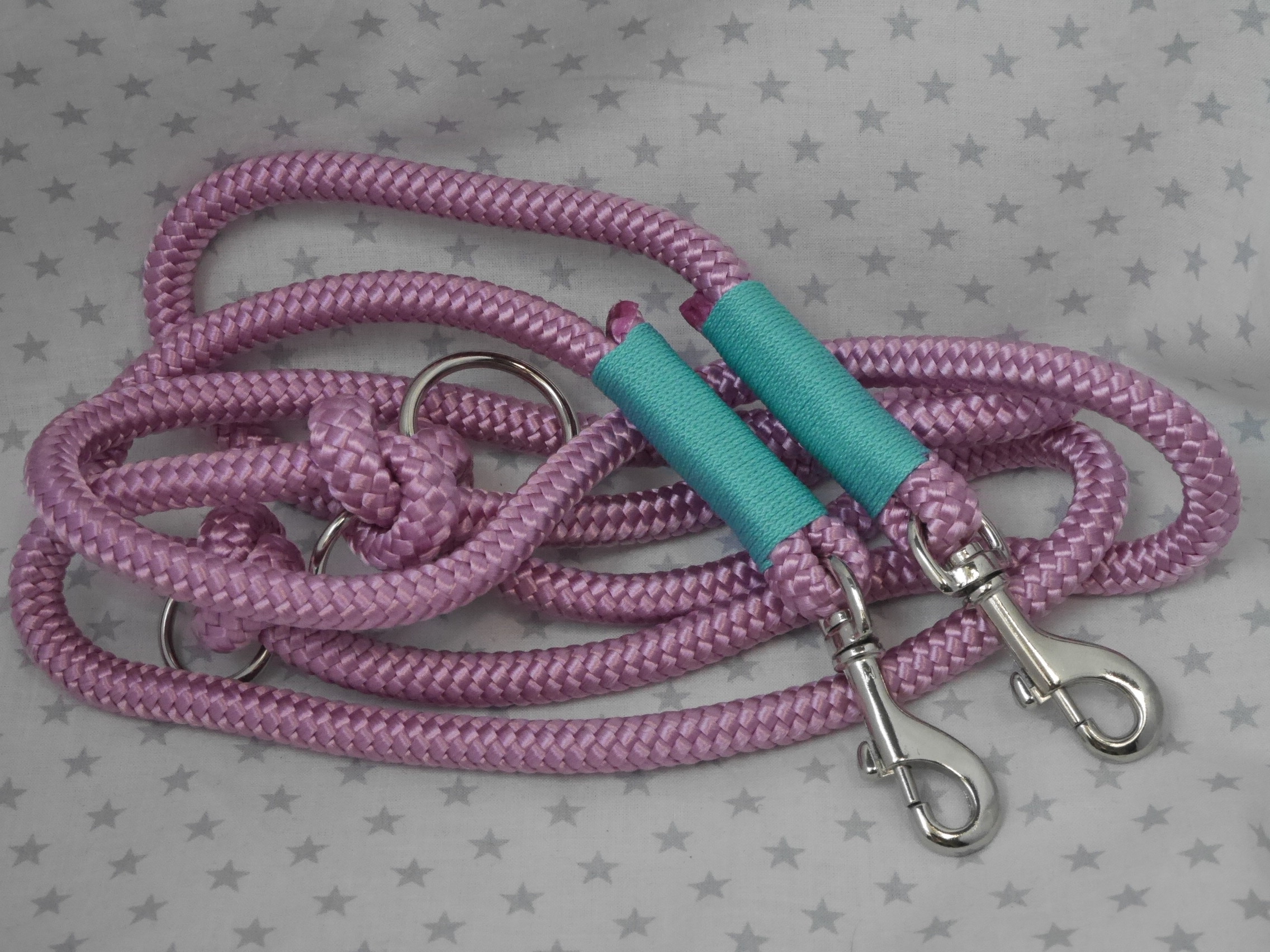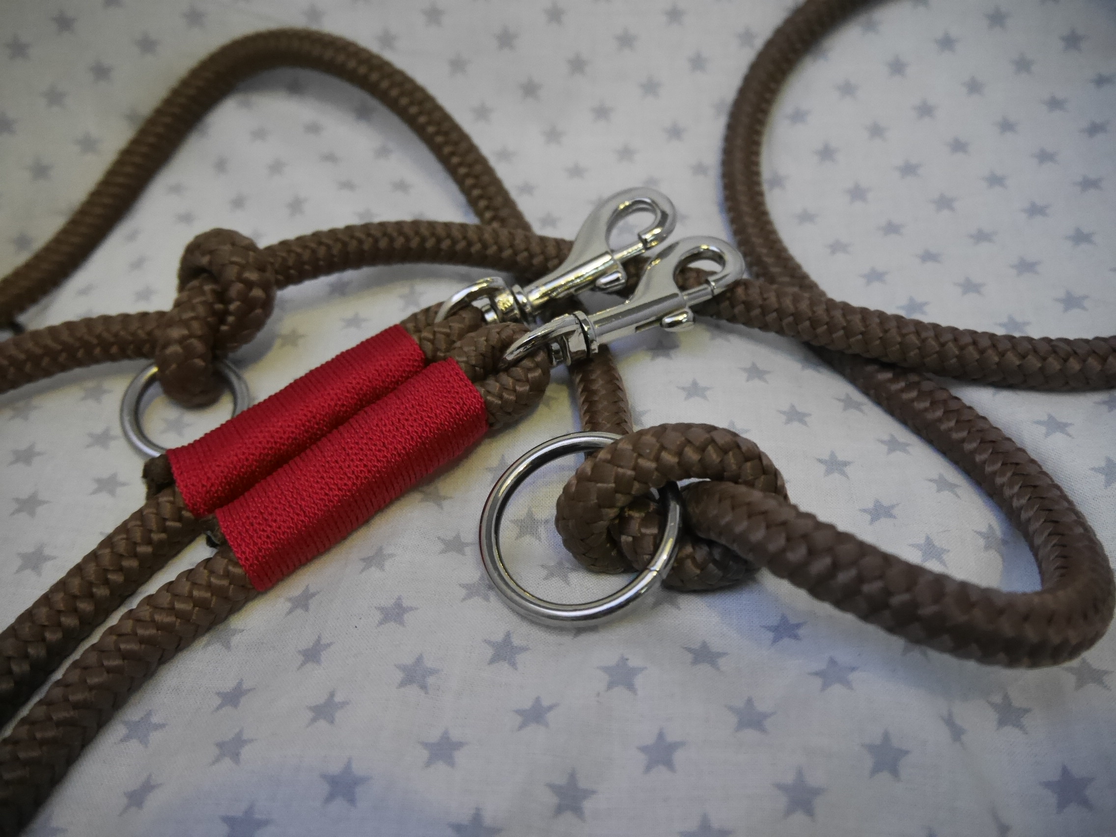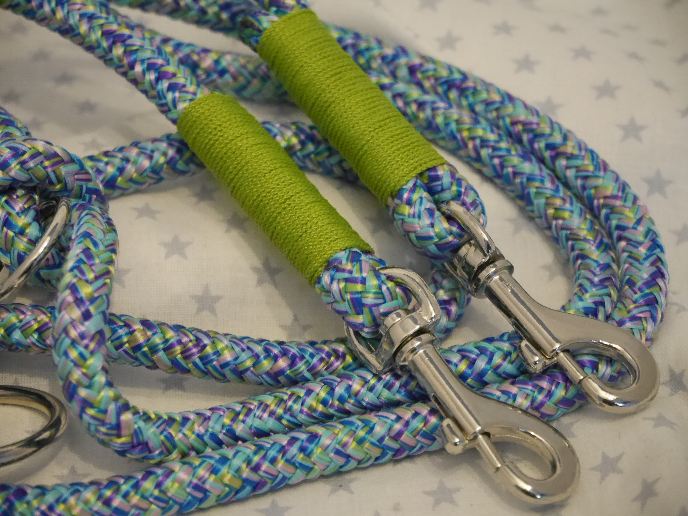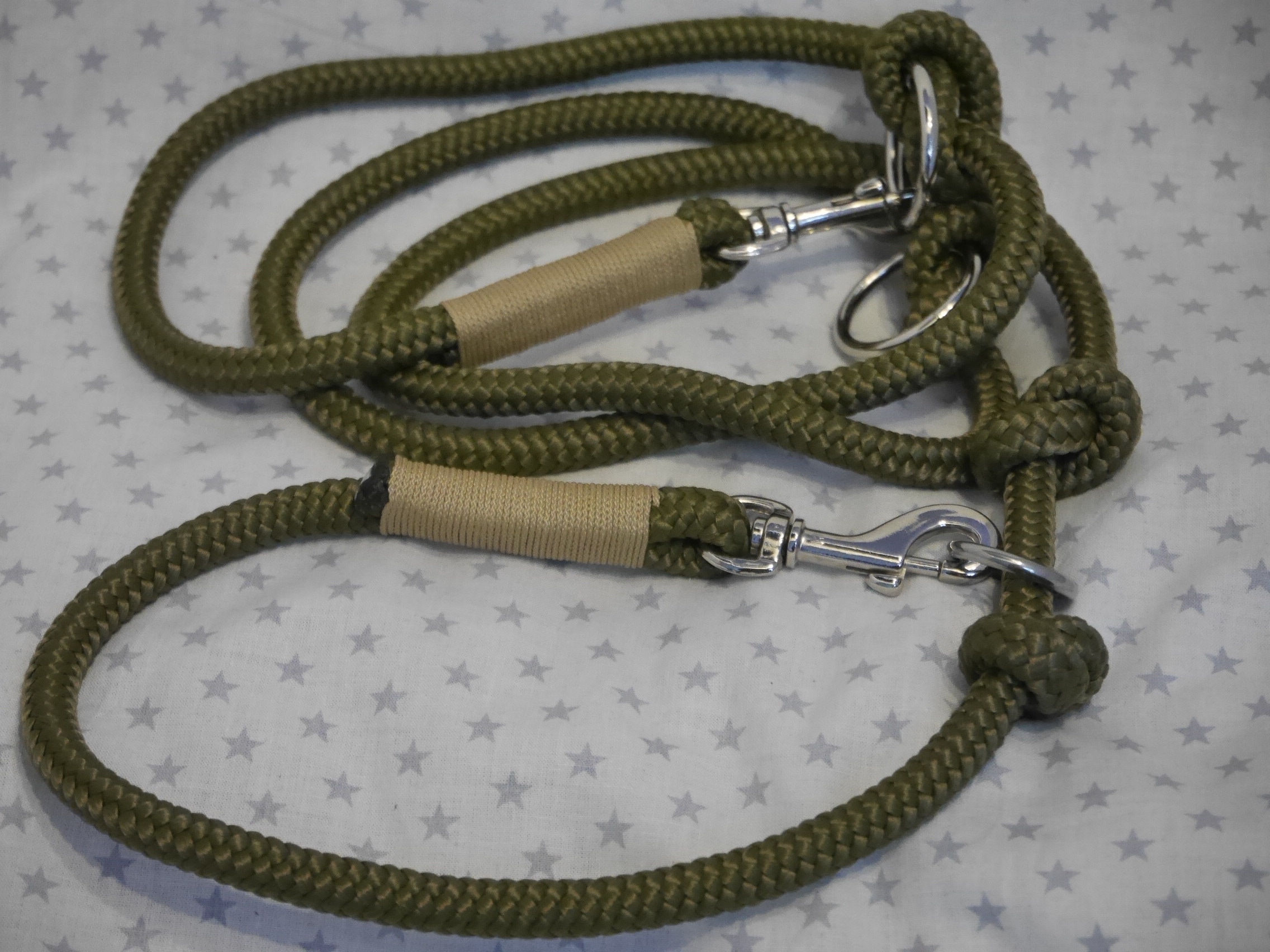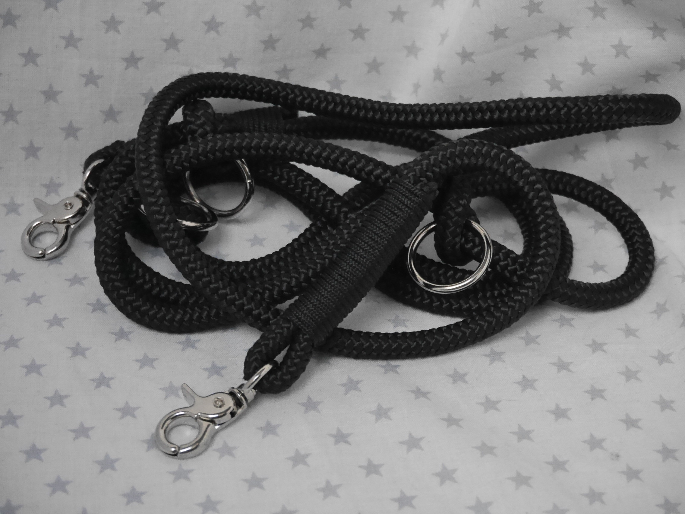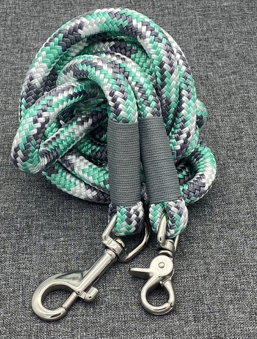 Ausführung: wenn nicht anders besprochen gibt es an beiden Enden einen Karabiner und auf die Länge verteilt 3 Verstell-Ringe. Diese können, da eingeknotet, gelöst und an beliebiger Stelle positioniert werden. So kann man Sie zB „crossover“ tragen oder einen „Hüftgürtel“ zum joggen daraus machen. Ausserdem kann man aus dem Ende ein ZugStoppHalsband bauen und hat bei Bedarf dann eine „RetrieverLeine“. Durch diese flexiblen Möglichkeiten gewinnt diese LeinenArt bei meinen Kunden immer mehr Zuspruch.