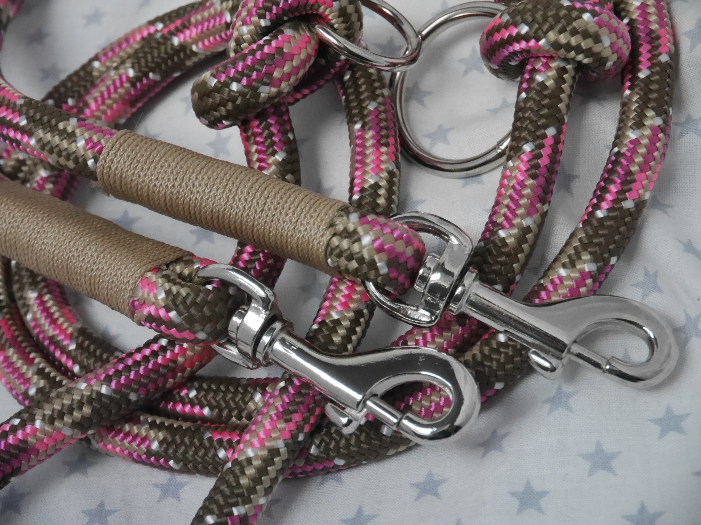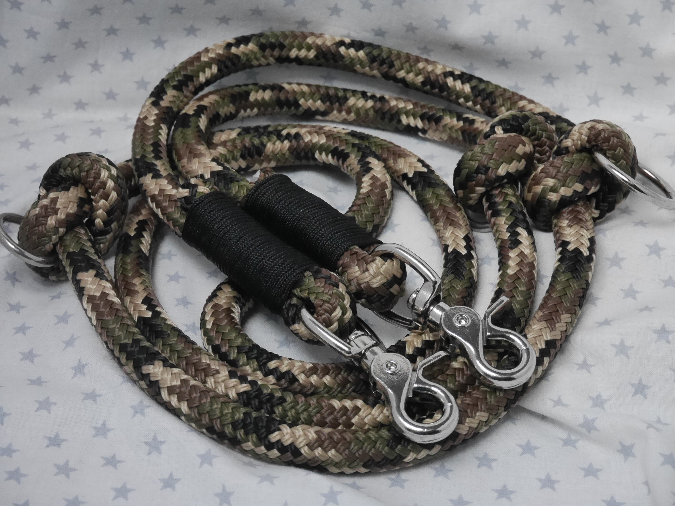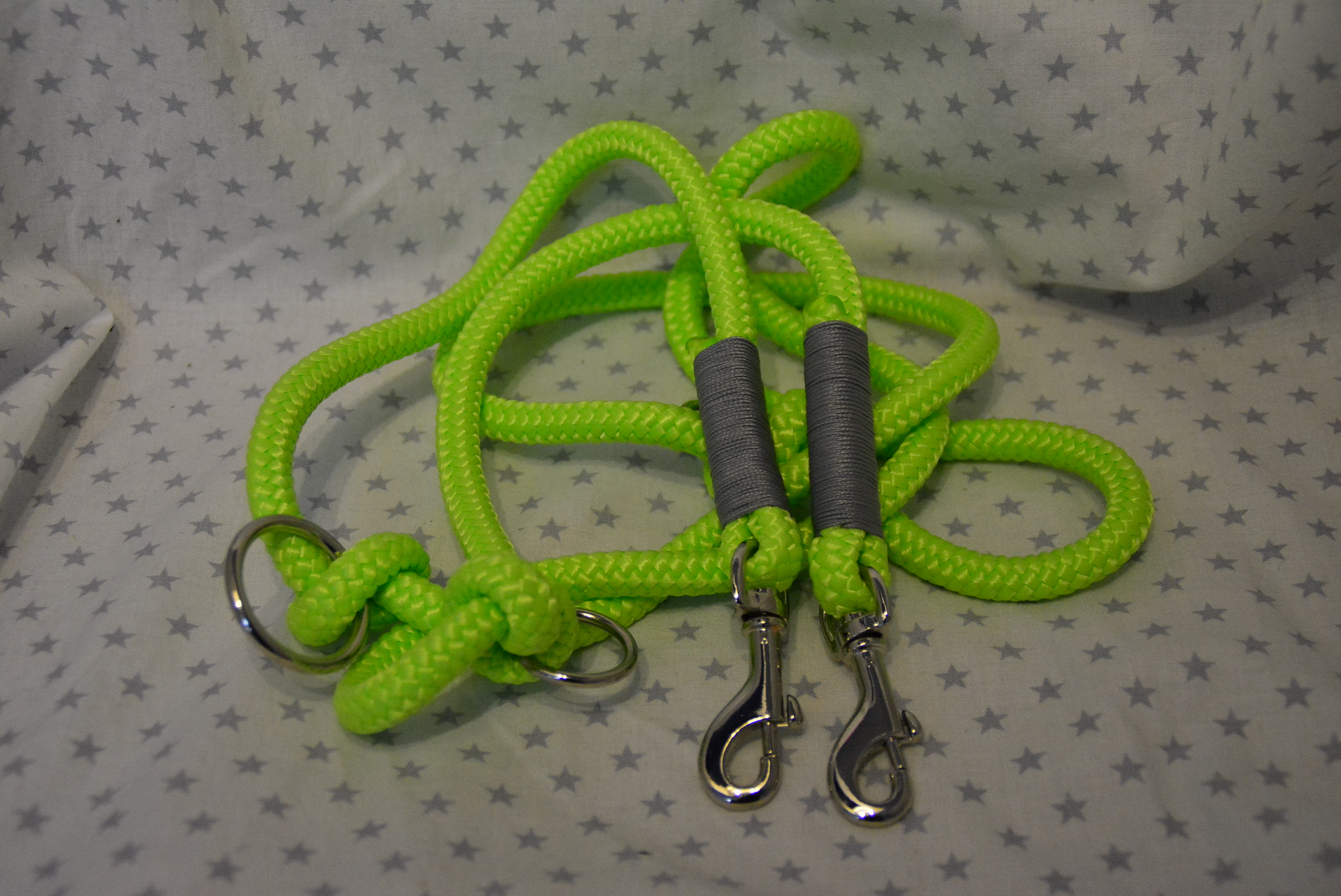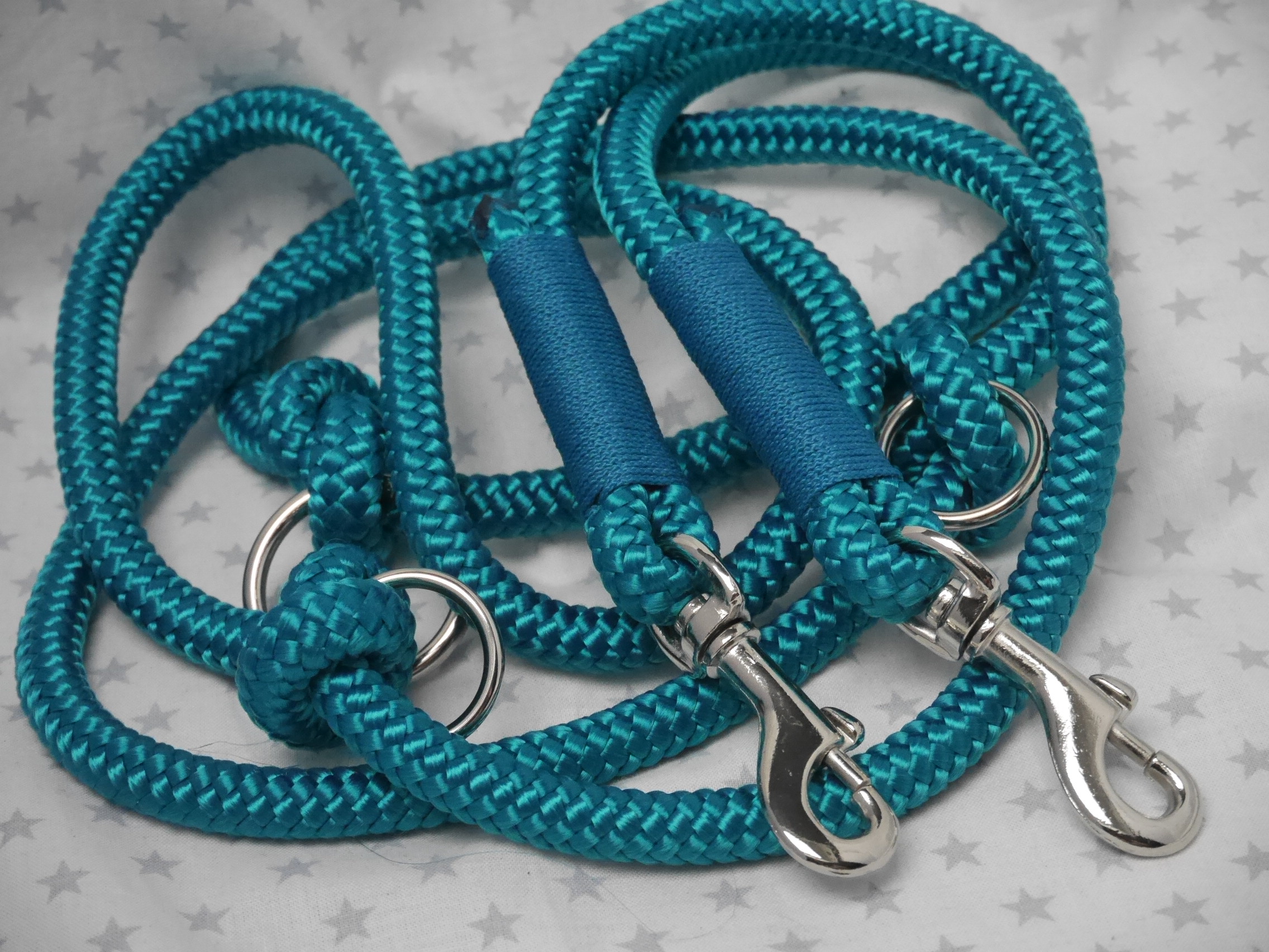 Ausführung: wenn nicht anders besprochen gibt es an beiden Enden einen Karabiner und auf die Länge verteilt 3 Verstell-Ringe. Diese können, da eingeknotet, gelöst und an beliebiger Stelle positioniert werden. So kann man Sie zB „crossover“ tragen oder einen „Hüftgürtel“ zum joggen daraus machen. Ausserdem kann man aus dem Ende ein ZugStoppHalsband bauen und hat bei Bedarf dann eine „RetrieverLeine“. Durch diese flexiblen Möglichkeiten gewinnt diese LeinenArt bei meinen Kunden immer mehr Zuspruch.