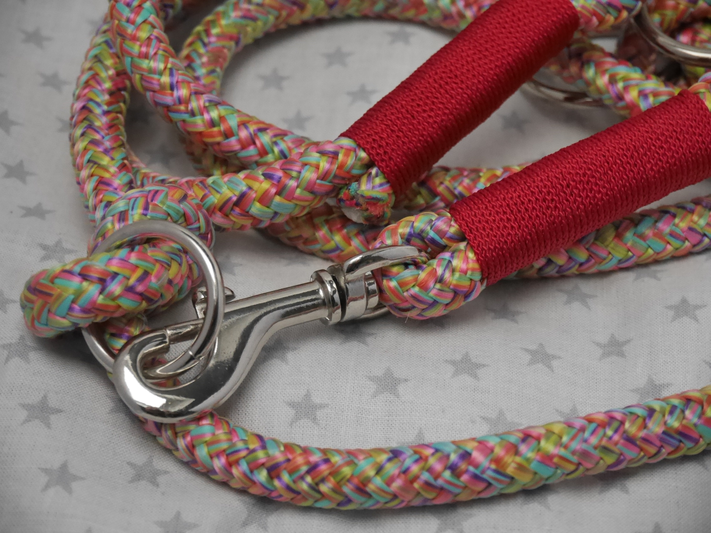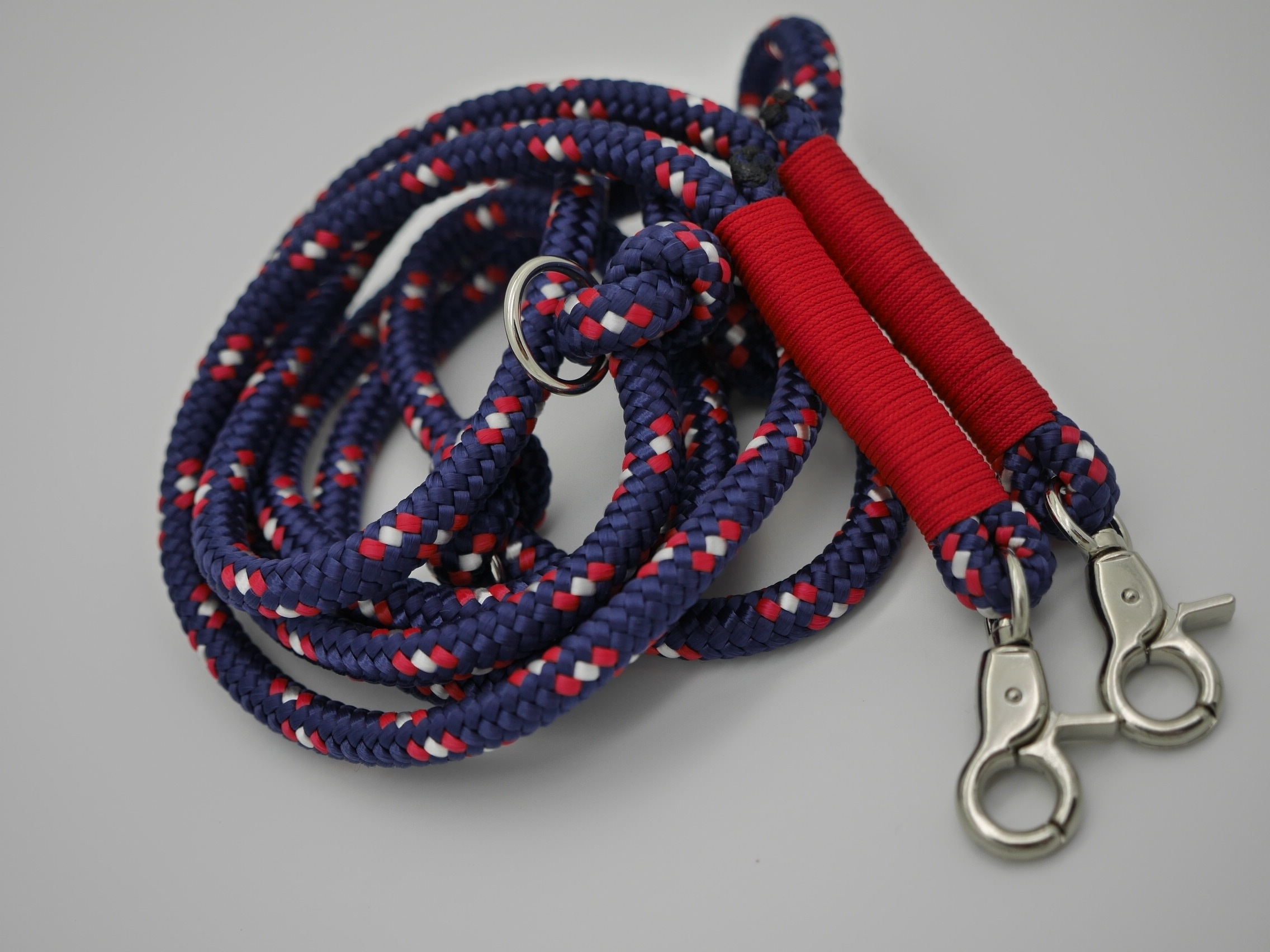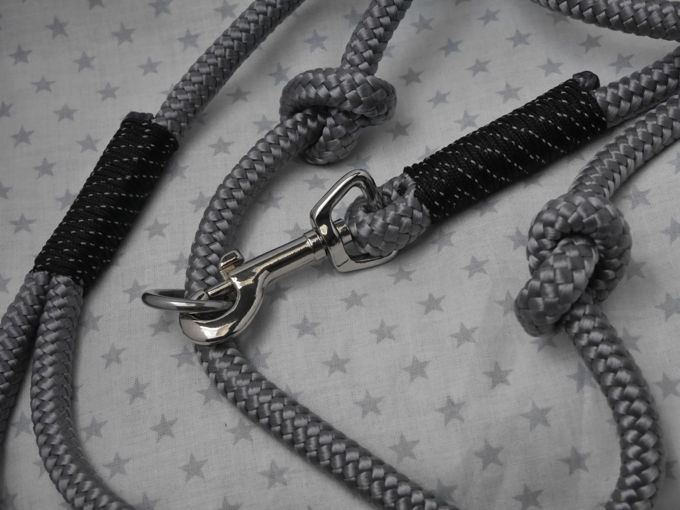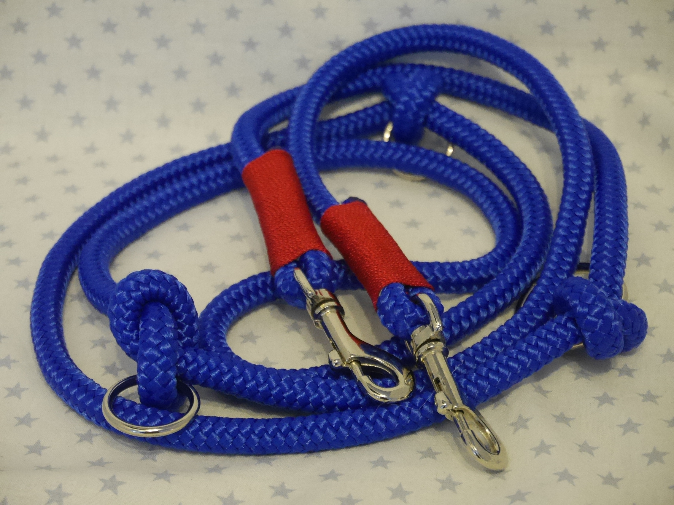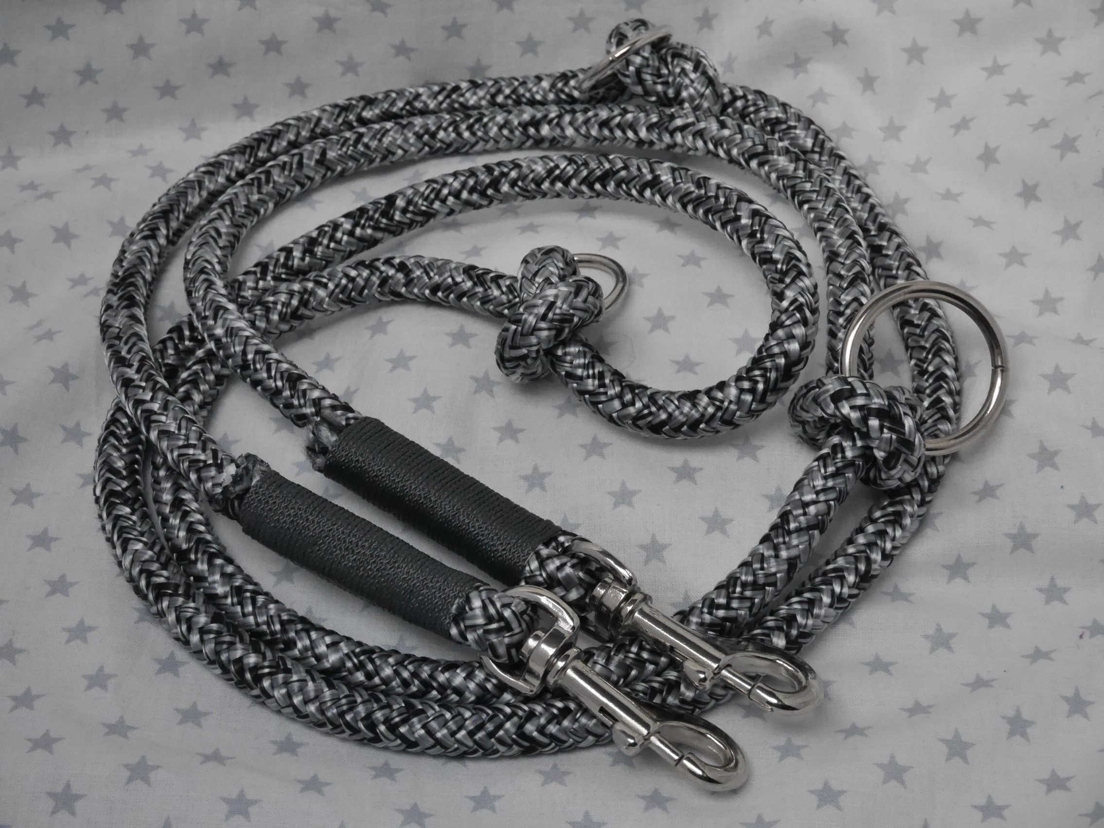 Ausführung: wenn nicht anders besprochen gibt es an beiden Enden einen Karabiner und auf die Länge verteilt 3 Verstell-Ringe. Diese können, da eingeknotet, gelöst und an beliebiger Stelle positioniert werden. So kann man Sie zB „crossover“ tragen oder einen „Hüftgürtel“ zum joggen daraus machen. Ausserdem kann man aus dem Ende ein ZugStoppHalsband bauen und hat bei Bedarf dann eine „RetrieverLeine“. Durch diese flexiblen Möglichkeiten gewinnt diese LeinenArt bei meinen Kunden immer mehr Zuspruch.