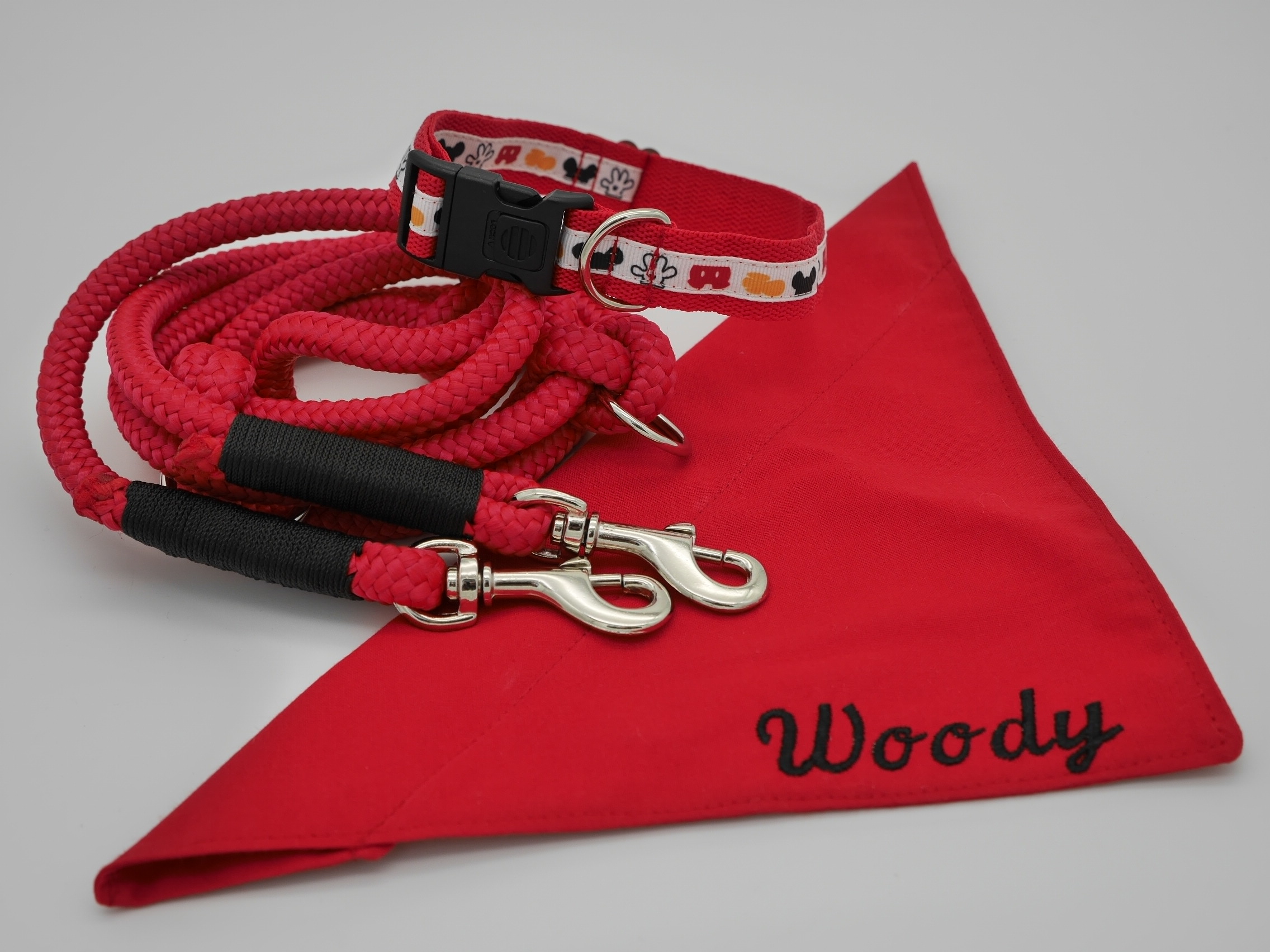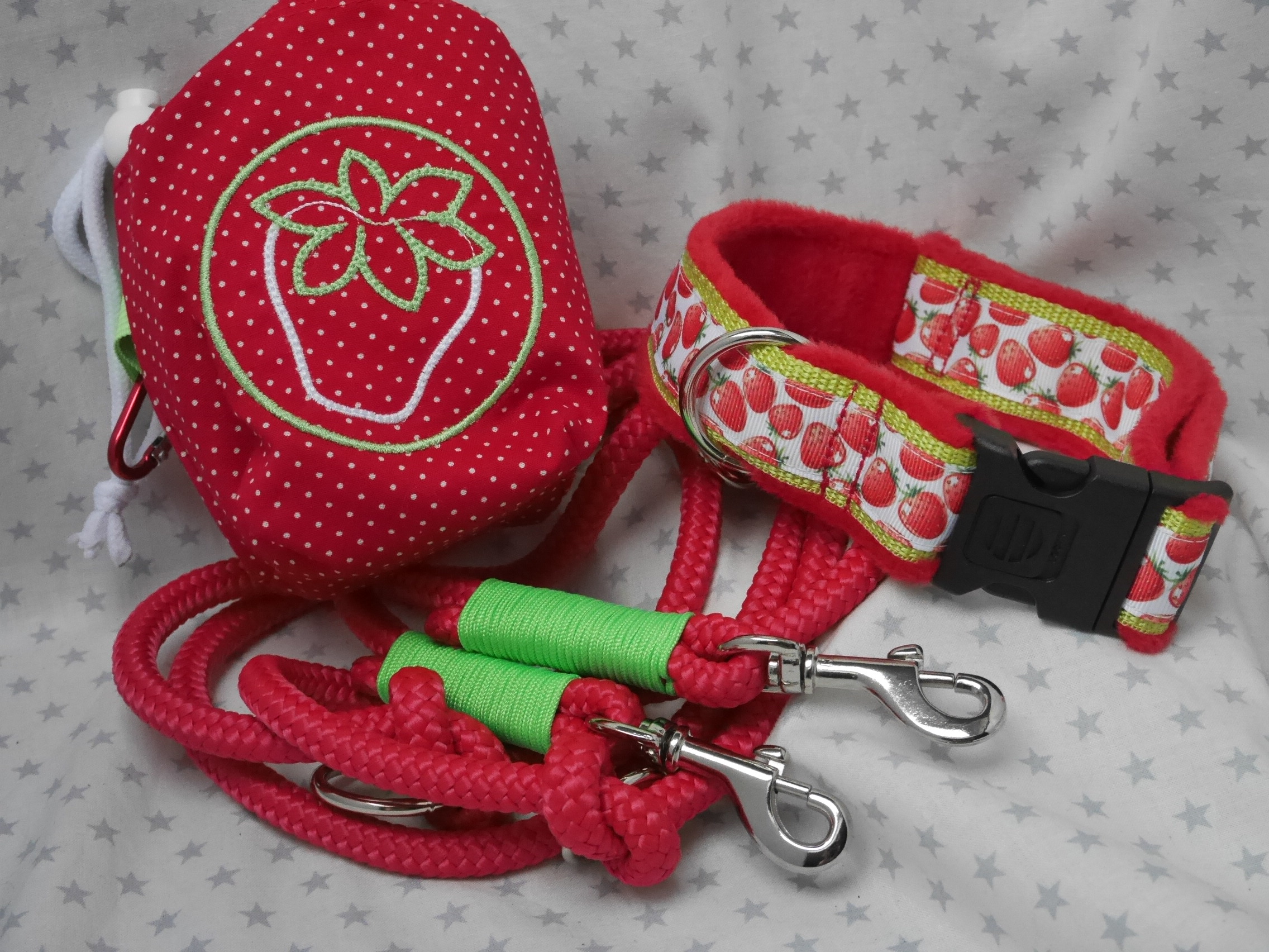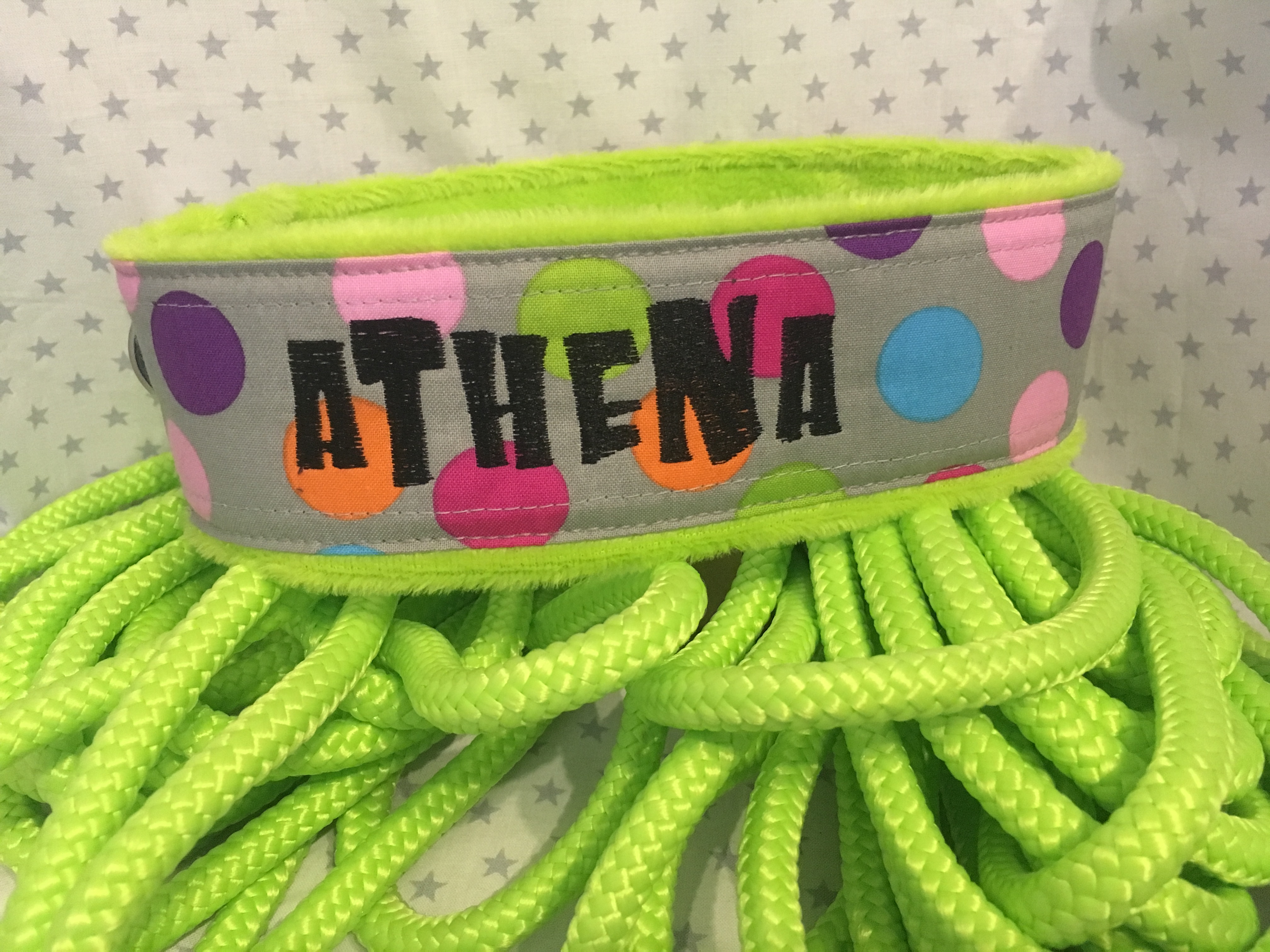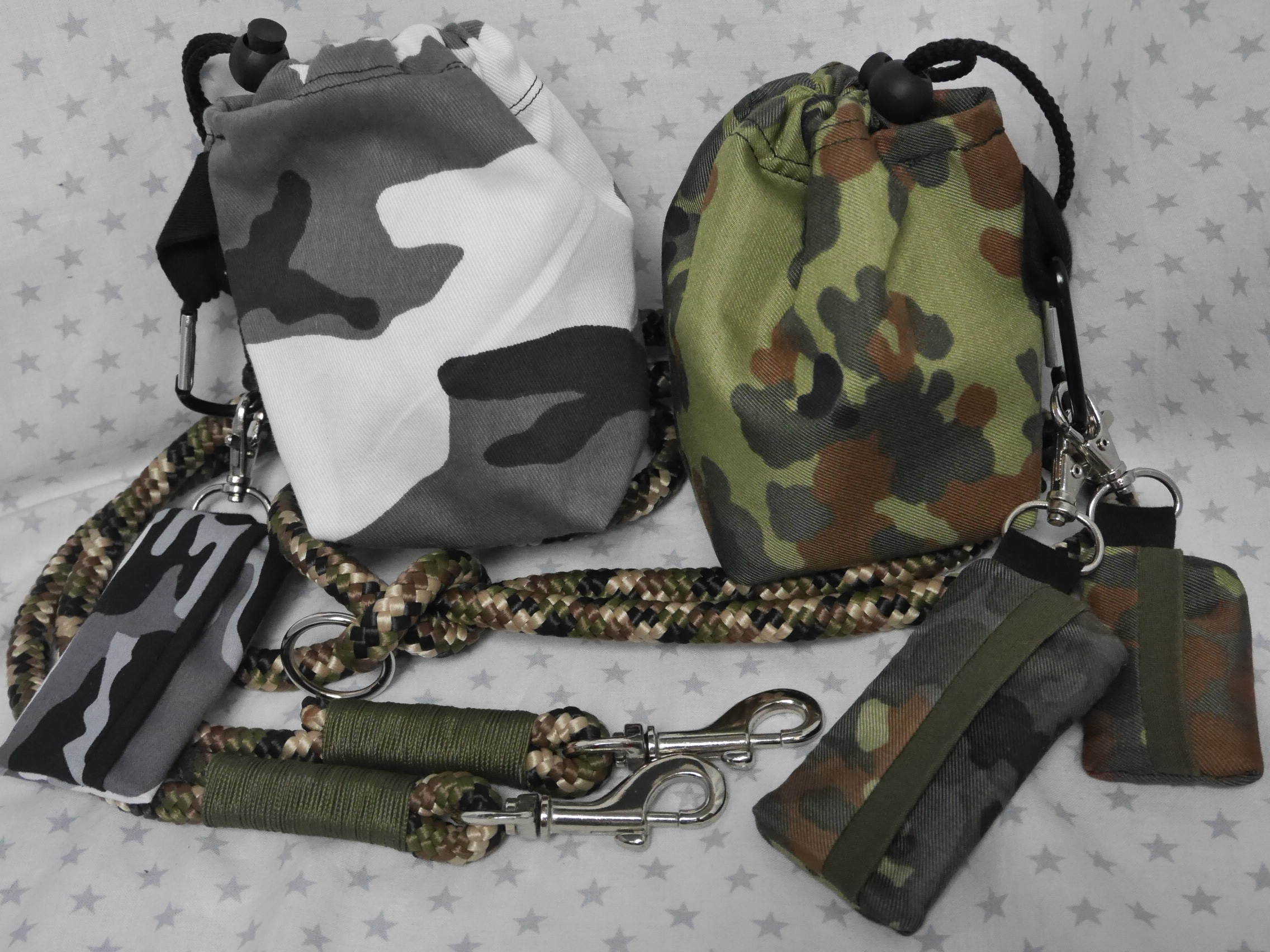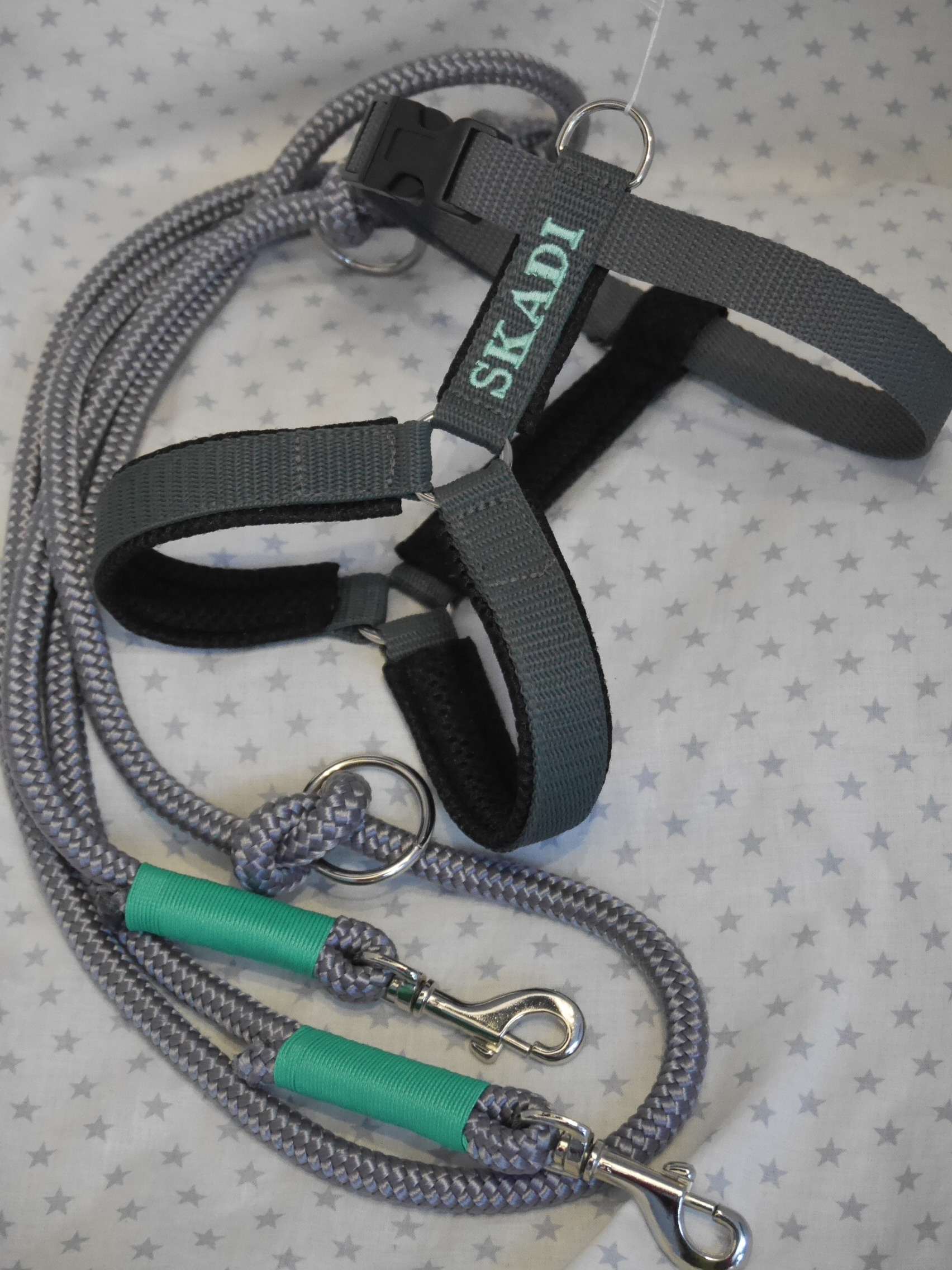 Ausführung: wenn nicht anders besprochen gibt es an beiden Enden einen Karabiner und auf die Länge verteilt 3 Verstell-Ringe. Diese können, da eingeknotet, gelöst und an beliebiger Stelle positioniert werden. So kann man Sie zB „crossover“ tragen oder einen „Hüftgürtel“ zum joggen daraus machen. Ausserdem kann man aus dem Ende ein ZugStoppHalsband bauen und hat bei Bedarf dann eine „RetrieverLeine“. Durch diese flexiblen Möglichkeiten gewinnt diese LeinenArt bei meinen Kunden immer mehr Zuspruch.